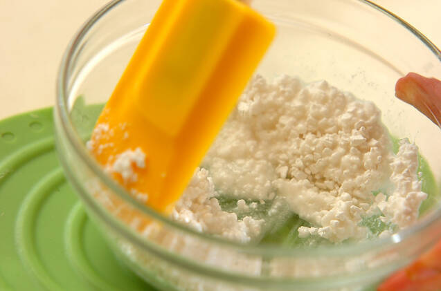 耐熱容器に白玉粉、砂糖を加えゴムベラで混ぜる。さらに水を少しずつ加え白玉粉を溶きのばす。