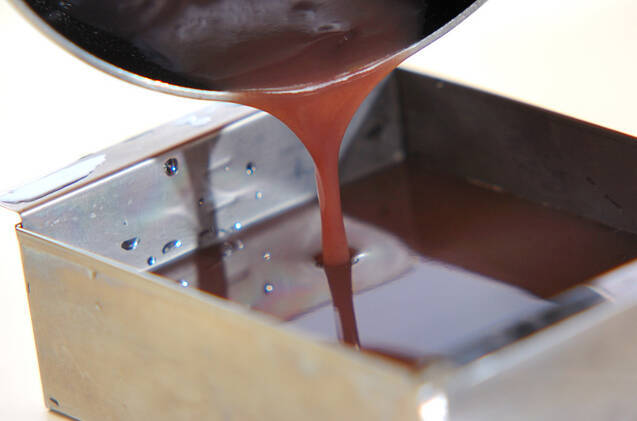 粗熱が取れたら水でぬらした流し型に流し入れ、冷やしかためる。かたまったら食べやすい大きさに切り、器に盛る。