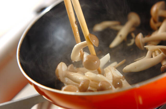 フライパンにシメジ、酒、塩を入れて中火にかけシメジがしんなりするまで炒める。<合わせダレ>のボウルにキュウリと一緒に入れて和え、器に盛り分ける。