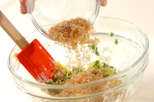 (1)のクリームチーズのボウルに、たくあんを加えて混ぜ合わせる。混ざったら細ネギ、かつお節を加え、さらに和えてしょうゆで味を調える。