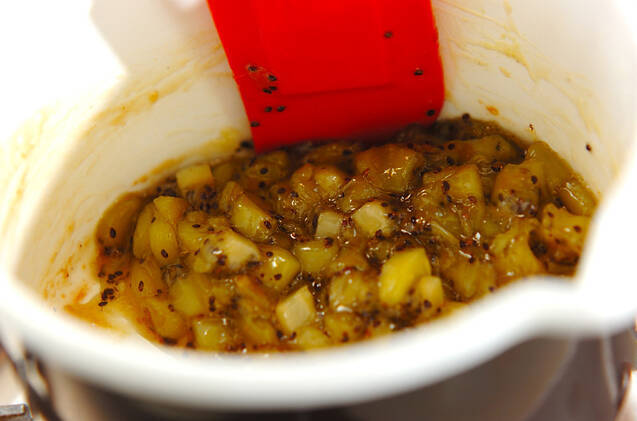<キウイジャム>を作る。キウイは皮をむいて5mm角に切り、小鍋に砂糖と共に入れて強火にかける。煮たったら火を少し弱め、常に煮たっている状態でアクを取りながら、ジャム状になるまで5~6分煮る。途中くっつかないように鍋をゆすって下さい。