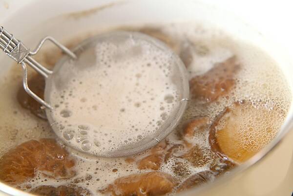 鍋にシイタケ、戻し汁を入れ中火にかけ、煮立てばアクを取り、落とし蓋をして火を弱め、15~20分、時々アクを取りながら煮る。シイタケがヒタヒタに浸かっている状態に戻し汁を調節して下さい。戻し汁が少ない場合は水を足して下さい。