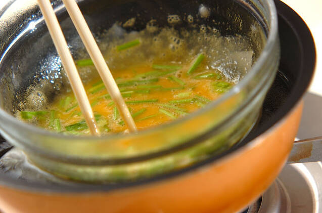 <調味料>の材料を加え、セリの茎の部分を入れて、湯せんにかける。