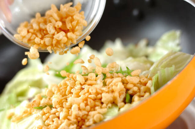 キャベツに火が通ったらキヌサヤ、天かす、ツナを加え、全体に火が通ったらお好み焼きソースを加えて味を調える。器に盛り、紅ショウガをのせる。