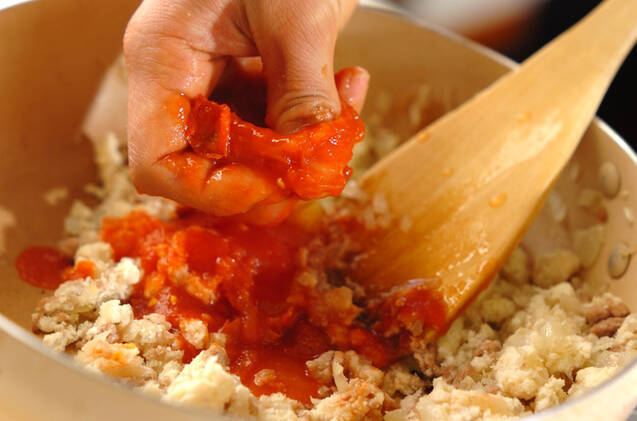 豚ひき肉に火が通ったらおからを加え、全体に油がまわったら水煮トマトを加える。(ヒント)水煮トマトがホールの場合は、手でつぶしながら加えて下さい。