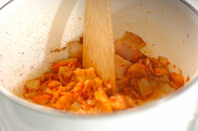 鍋にゴマ油を中火で熱し、豚バラ肉、白菜キムチを加えて炒める。