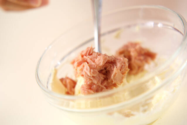 <合わせクリームチーズ>のクリームチーズは常温に出して柔らかくもどし、ツナと混ぜ合わせる。