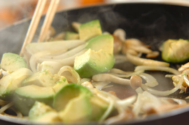 (1)のフライパンに残りのオリーブ油を入れて熱し、玉ネギ、シメジを炒め、しんなりしたらアボカドを加えてサッと炒め合わせる。
