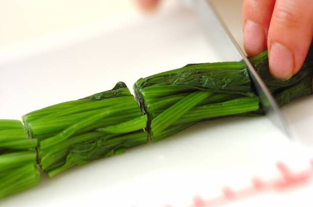 ホウレン草は熱湯でサッとゆで、冷水に取って冷まし、水気を絞る。根元を切り落とし、長さ3cmに切る。卵は割りほぐす。