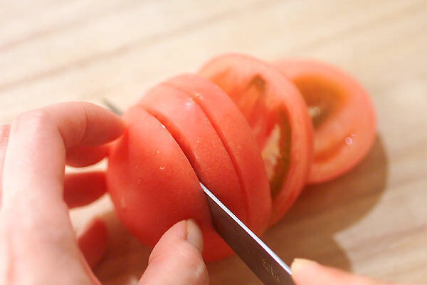 トマトはサッと水洗いしてヘタをくり抜き、1個を縦4~5等分に切り、モッツァレラチーズは8~10等分に切る。バジルの葉は軸を取っておく。