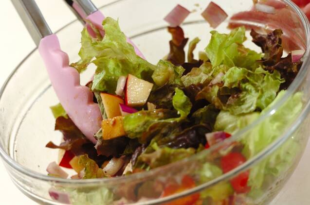 <ドレッシング>のボウルに下準備をした鶏ささ身、野菜、クルミを入れて混ぜ、全体にドレッシングがからまったら、器に盛る。