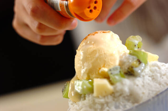氷にバニラアイスをのせ、パイナップル、キウイ、タピオカをまわりに飾る。<ココナッツシロップ>をかけ、上からシナモンパウダーを振る。
