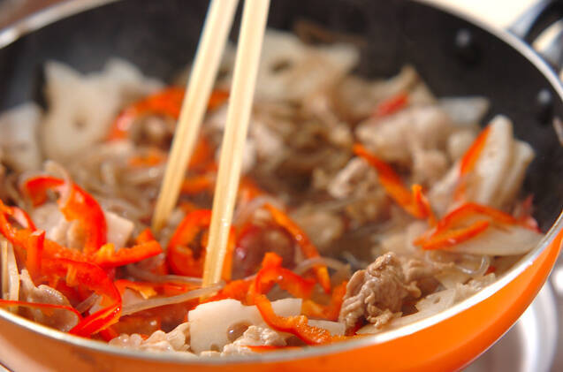 赤ピーマン、<調味料>の材料を加えて炒りつけながら炒め、汁気が無くなったら器に盛る。