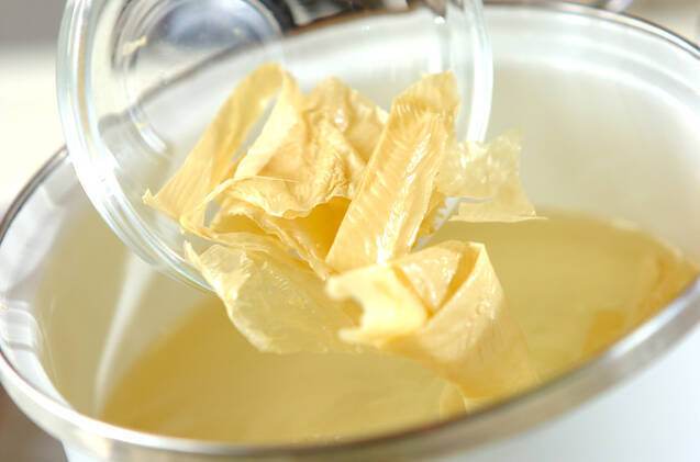 鍋にだし汁、折れ湯葉を入れて強火にかけ、煮たったら<調味料>の材料を加える。