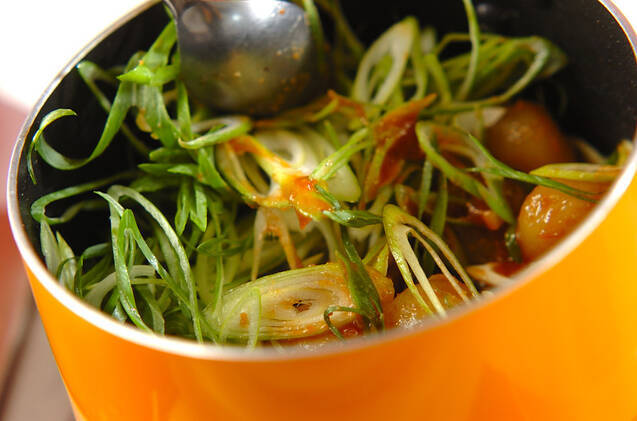 煮汁が少なくなるまで煮て、最後に九条ネギを加えてサッと混ぜる。器に盛り、一味唐辛子を振る。