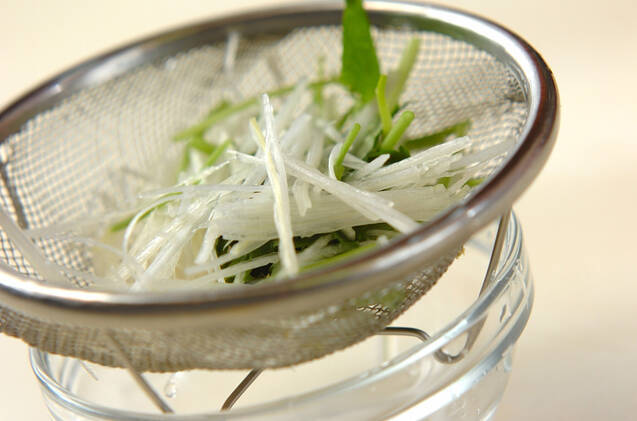 ミツバは水洗いし、根元を切り落として長さ4cmに切り、白髪ネギと合わせる。
