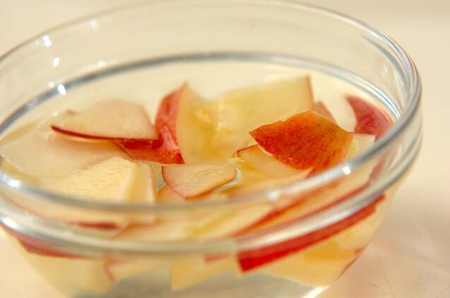 リンゴは皮ごときれいに洗い、芯を取って薄切りにする。分量外の塩を入れた塩水にサッと通し、水気を拭き取る。