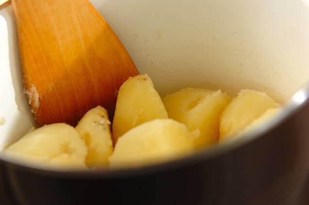 鍋にジャガイモと水を入れ、強火で熱する。 煮たったら火を少し弱め、竹串がスッと刺さるまで10~12分ゆでる。ゆで汁を捨て、強火にかけてジャガイモの水分を飛ばす。