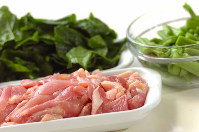 鶏もも肉は太い筋と余分な脂を取り除き、食べやすい細切りにして塩をもみ込む。ツルムラサキは茎と葉に分け、茎は長さ3cmに切る。