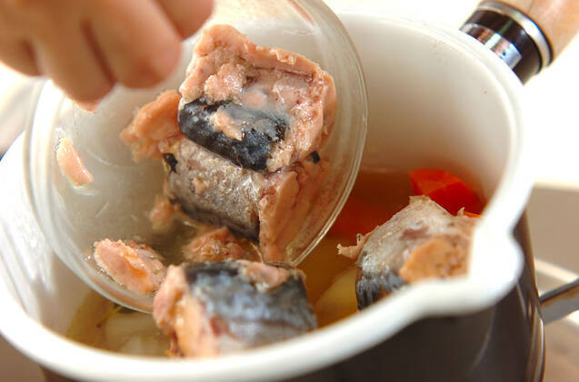 鍋に(1)、水、ローリエを入れて中火で加熱する。沸騰したらサバ缶を汁ごと入れる。
