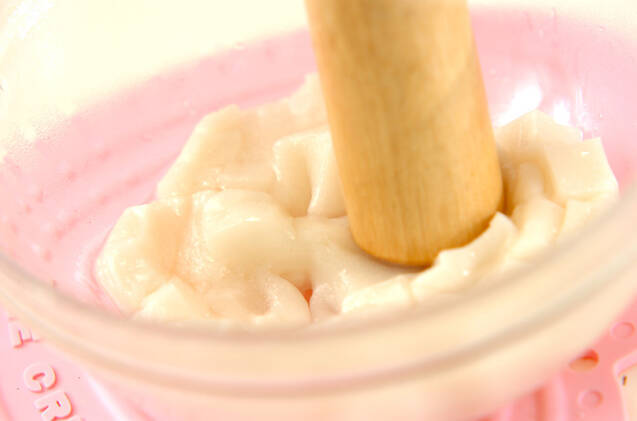 耐熱容器にお餅と砂糖を入れてラップをかけ、電子レンジで1~2分加熱し、柔らかくなったらぬらしためん棒でつく。電子レンジは600Wを使用しています。