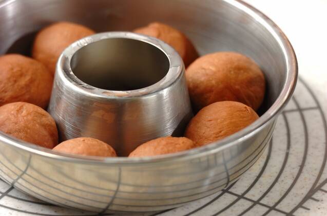 再び軽くガス抜きをした生地をきれいに丸めなおし、顔本体の生地を閉じ目を下にして型に均等に入れる。耳は乾燥しないようにボウル等を被せておく。