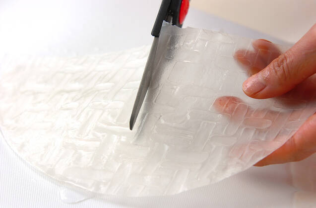 ライスペーパーの両面に霧吹きで水を吹き、少し柔らかくなったらはさみで4等分に切る。
