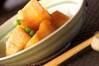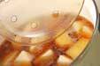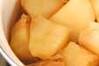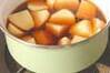 鍋にだし汁、<調味料>、水切りしたジャガイモを入れて強火にかけ、煮立てば落とし蓋をして常にクツクツ煮えている火加減でジャガイモが柔らかくなるまで煮る。