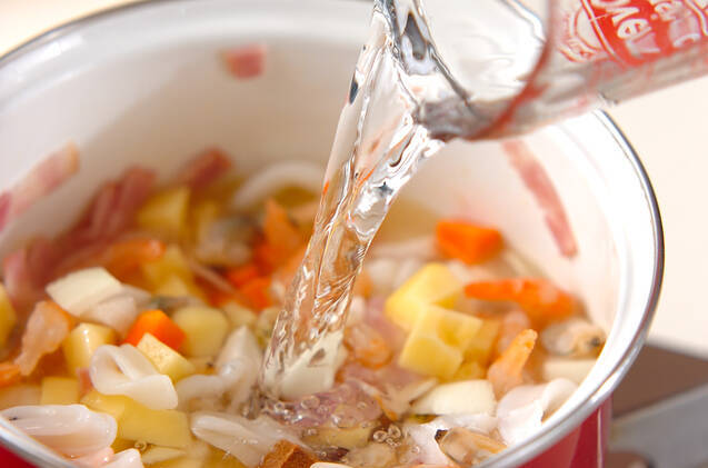 全体にバターが絡まったら、シーフードを加えてサッと炒め、<スープ>を加える。煮立ったら火を弱めて10分煮、牛乳を加え、煮立つ直前でマカロニを加え、コショウで味を調える。