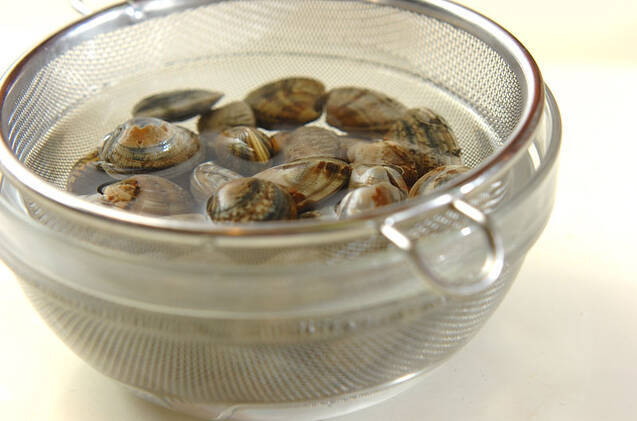 アサリは殻と殻をこすり合わせて洗い、ザルに上げる。