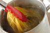 深めのフライパンにコーンスープの素と牛乳を入れて火にかけ、トロミがついてきたら生クリームを加えて混ぜ合わせ、(1)のスパゲティーを加える。