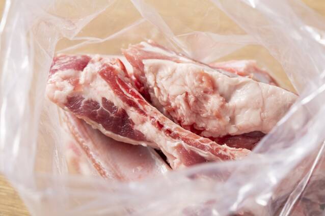 骨付き豚バラ肉はフォークで何箇所か刺し、丈夫なビニール袋に入れる。