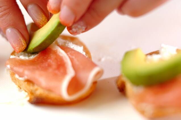 <生ハムとアボカドのサンド>を作る。バゲットにカッテージチーズをぬり、生ハムとアボカドをのせてイタリアンパセリを飾ってできあがり。お好みでオリーブ油とコショウをつけて食べる。