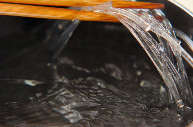 葛きりは袋の指示に従ってゆで、ザルに上げる。