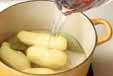 鍋に水気をきったジャガイモ、<スープ>を入れて中火にかける。