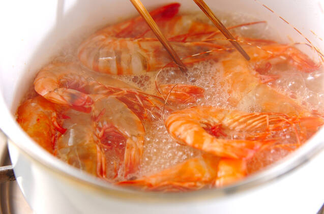 鍋に酒、塩を入れて強火にかけ、煮立ってきたら1のエビを加え、エビが「つ」の字になって赤くなったらしっかり火を通し、薄口しょうゆを加えて火を止め冷ます。