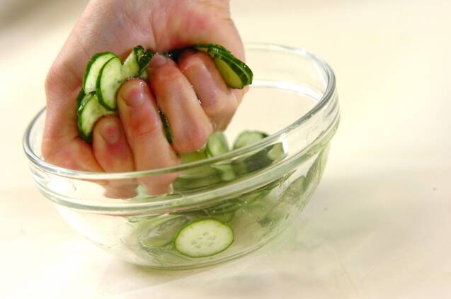 キュウリは薄い輪切りにして塩でもみ、しんなりしたら水気を絞る。