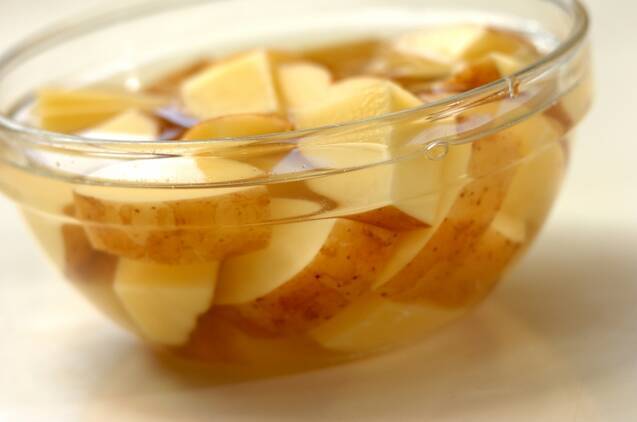 ジャガイモは皮ごと水洗いして水気をしっかり拭き取り、ひとくち大に切って水に放ち、白濁したらザルに上げて水気を拭き取る。