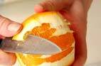 オレンジは皮をむき、中の薄皮も取って果肉だけにし、ザルに上げておく。
