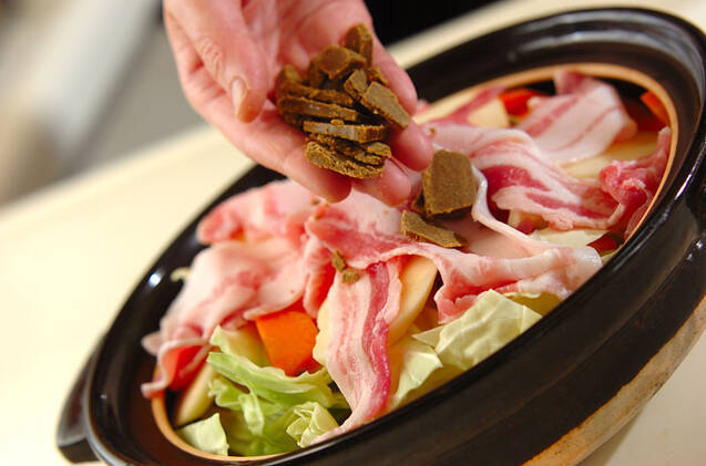 さらに刻んだカレールウ、トマトジュースを入れて中火でひと煮たちさせ、蓋をして10分程度蒸す。