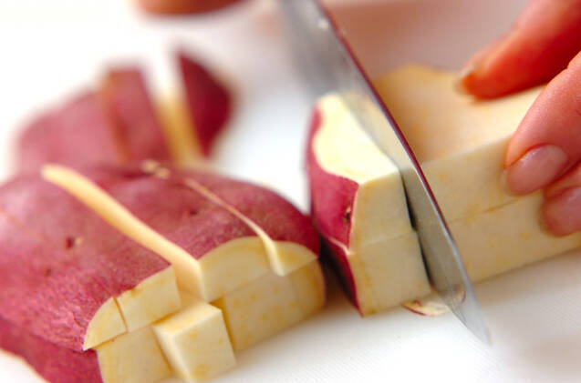 サツマイモは皮ごと水洗いし、少し大きめの拍子切りにして、分量外の塩水に放つ。