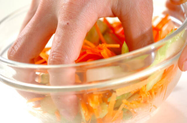 セロリは筋を引いて斜め薄切りにし、ニンジンは皮をむいて縦にせん切りする。セロリとニンジンをボウルに入れ、分量外の塩少々を加えて軽くもみ、5分程おいてから水気を絞る。