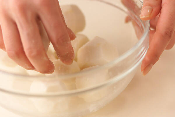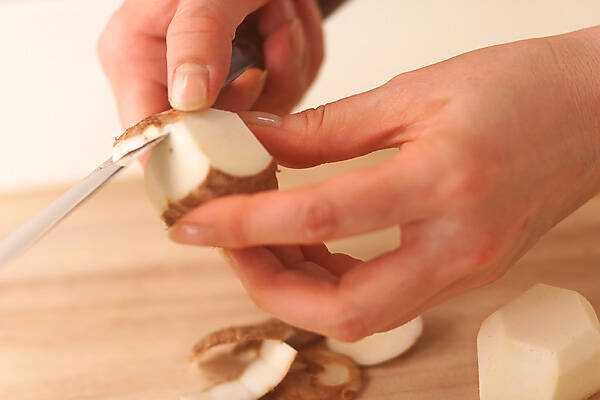里芋はきれいに水洗いして水気を拭き取り、上下を切り落とし、縦に厚めに皮をむく。大きい場合は、横半分に切る。塩でもみ、ぬめりが出ればサッと水洗いする。