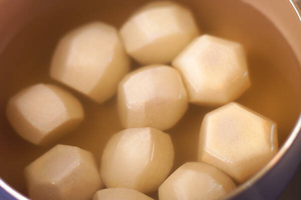 鍋に里芋とだし汁を入れて強火にかけ、煮立ったら中火で5~6分煮る。酒、みりん、砂糖を加え、更に5~6分煮る。