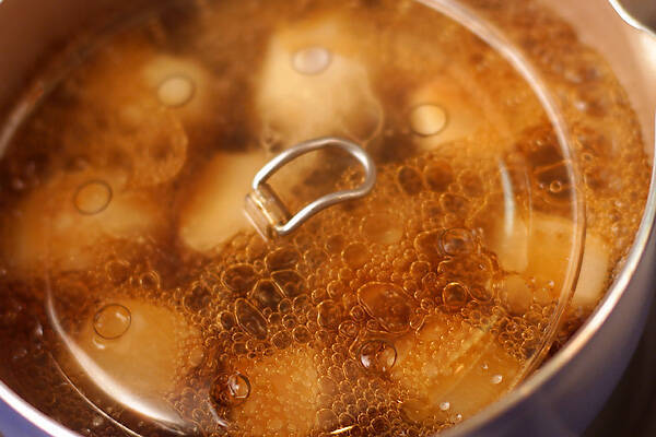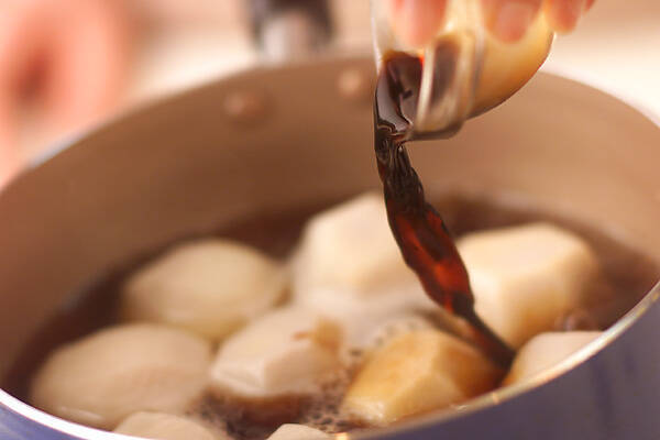 しょうゆとサラダ油を加えて落とし蓋をし、煮汁が少なくなるまで煮含める。(しょうゆは砂糖やみりんの後に加える方が、全体の味のしみこみが良くなります。)