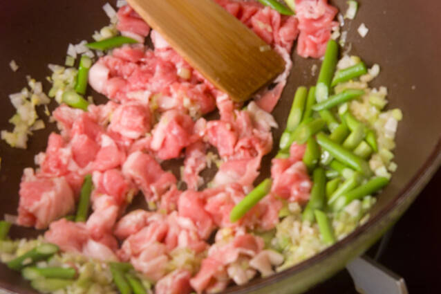 中華鍋にゴマ油大さじ1.5を強火で熱し、白ネギ、ショウガを加え、香リが立てば、豚肉、ニンニクの芽を入れて炒めあわせる