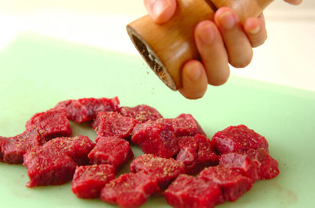 牛ステーキ肉はひとくち大に切り、塩コショウを全体に振る。甘長唐辛子は軸を切り揃える。