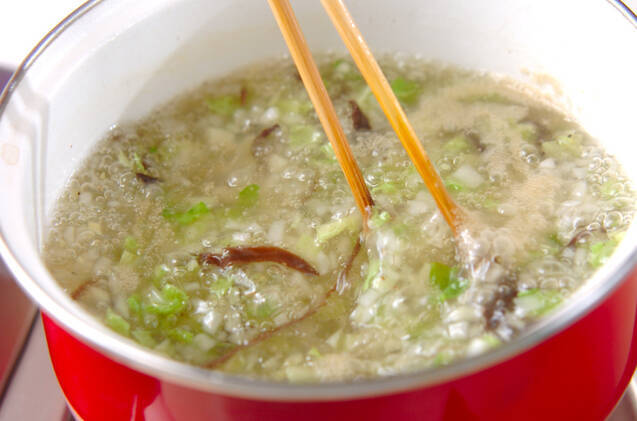 しんなりしてきたら<スープ>を加えて煮立たせ、アクを取って<調味料>を加える。<水溶き片栗>をまわし入れてトロミをつける。