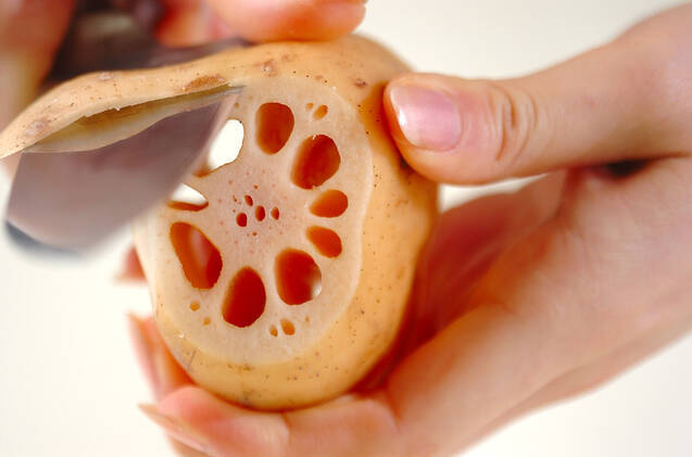 レンコンは皮をむいて水に10分放ち、水気を拭き取り薄切りにする。