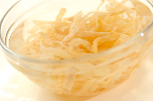 塩クラゲはたっぷりの水につけて塩気を抜き、水気をきって食べやすい長さに切る。(ヒント)調理時間に塩気を抜く時間は含みません。
